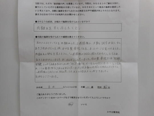 右のハムストリングスを肉離れした、2週間後に、大事な試合があり、少しあきらめかけていた時、かやま整骨院さんを、ホームページで見つけました。肉離れの部分を見てもらい、「二週間後の試合に間に合わせよう」と言われ、あきらめかけていましたが、がんばろうと思いました。他の整骨院では「絶対安静」としか言われませんでしたが、「少しずつ動いて、ピークをその試合にもっていこう」と言われ、ここの整骨院ならがんばれると思いました。部活動の時間にも対応してくださり、二週間後の試合では、自分の思ってた以上の力を出すことができました。ありがとうございました。