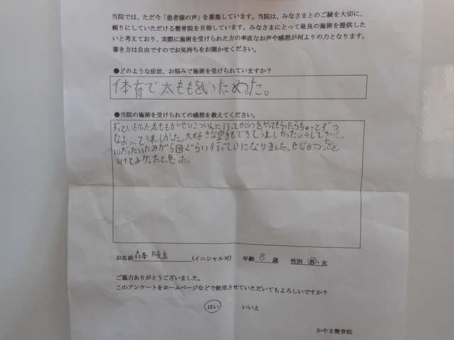 ずっといたかった太ももがせいこついんに行ってせじゅつをやってもらったらちょっとずつなおってうれしかった。大好きな空手もできてうれしかった。そしてさいしょ10だったいたみが5回ぐらい行って0になりました。せじゅつをうけてよかったと思った。