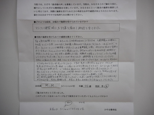 自己ベストとはいきませんでしたが、3時間44分台で走れました。けがした当時から思えば考えられないタイムです。先生のおかげでこのタイムで走れたと感謝しています。