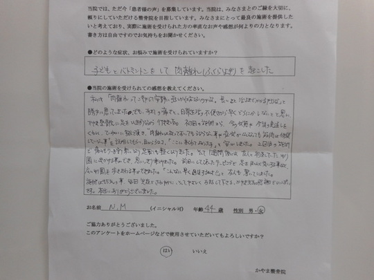 施術はもちろんの事、毎回笑顔でさわやかに、そしてやさしくお話して下さる、かやま先生に感謝でいっぱいです。本当にありがとうございました。