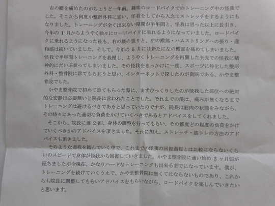 そのような過程を踏んでいく中で、これまでの怪我の回復過程とは比較にならないくらいのスピードで身体が怪我から回復していきました。かやま整骨院に通い始め2ヶ月弱が経ちましたが今現在、かなりハードなトレーニングも出来るまでになっています。僕が、トレーニングを続けていくうえで、かやま整骨院は無くてはならないものであり、これからも院長に調整してもらいアドバイスをもらいながら、ロードバイクを楽しんでいきたいと思います。