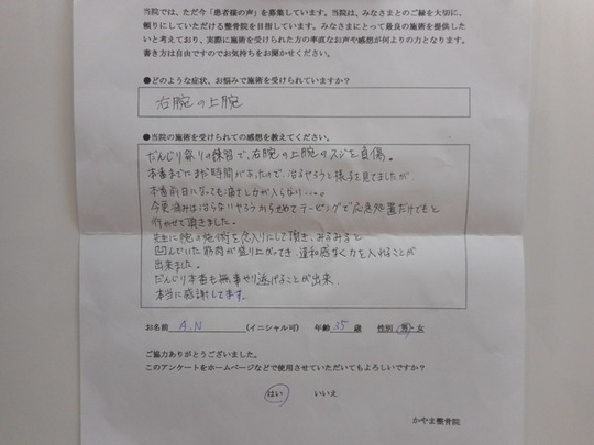 大事なだんじり祭りを無事に痛みなくやり遂げていただき、その後は、上腕の奥の方に少し痛いような感覚と上腕のストレッチをした時に違和感がありましたが、それらも数回の調整で完全に回復しました。