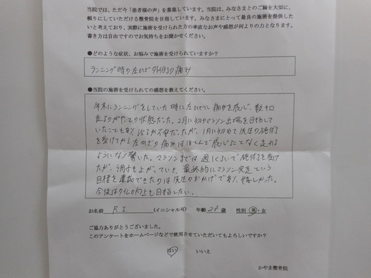 年末にランニングをしていた時に左ひざに痛みを感じ、数キロ走るのがやっとの状態だった。2月に初のマラソン出場を目指していたこともあり、治るか不安だったが、1月に初めて先生の施術を受けてから左ひざの痛みはほとんど感じることなく走れるようになり驚いた。マラソンまでは週1くらいで施術を受けたが、調子も上がっていき、最終的にマラソン完走という目標を達成できたのは先生のおかげであり、嬉しかった。今後はタイムの向上も目指したい。