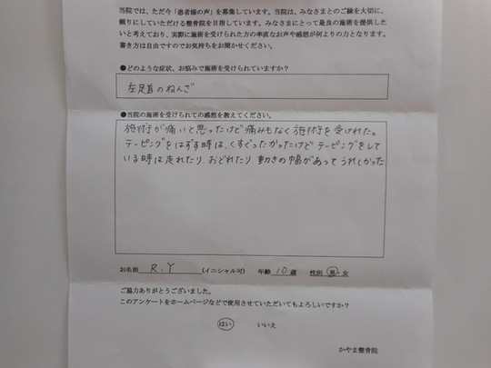 今回の男の子は、捻挫したその日に当院に来られましたので、回復も順調で早かったです。
