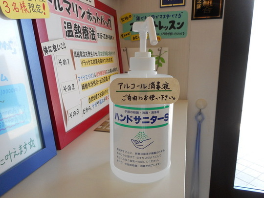 待合室に手指消毒液を設置しておりますので、ご来院時にはご自由にお使い下さい。