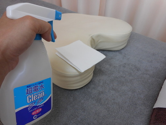患者様お一人の施術が終わるごとに、超電解水等で胸マットやマクラ等の除菌を徹底しておりますので、いつも清潔な状態で施術を受けていただけます。