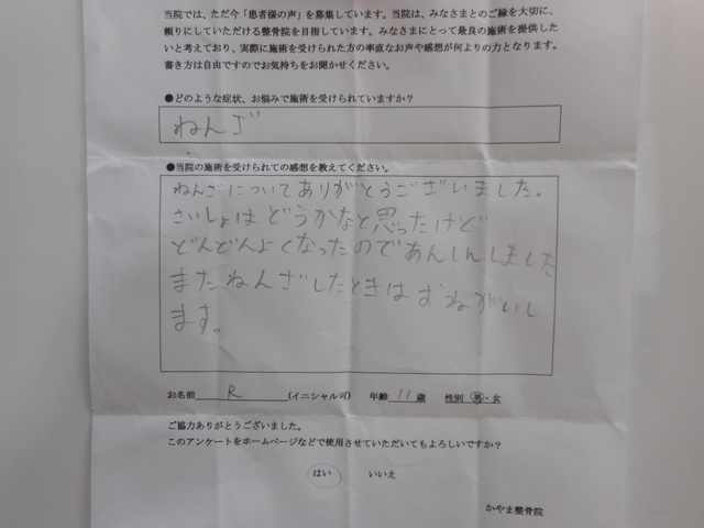 ねんざについてありがとうございました。さいしょはどうかなと思ったけどどんどんよくなったのであんしんしましたまたねんざしたときはおねがいします。