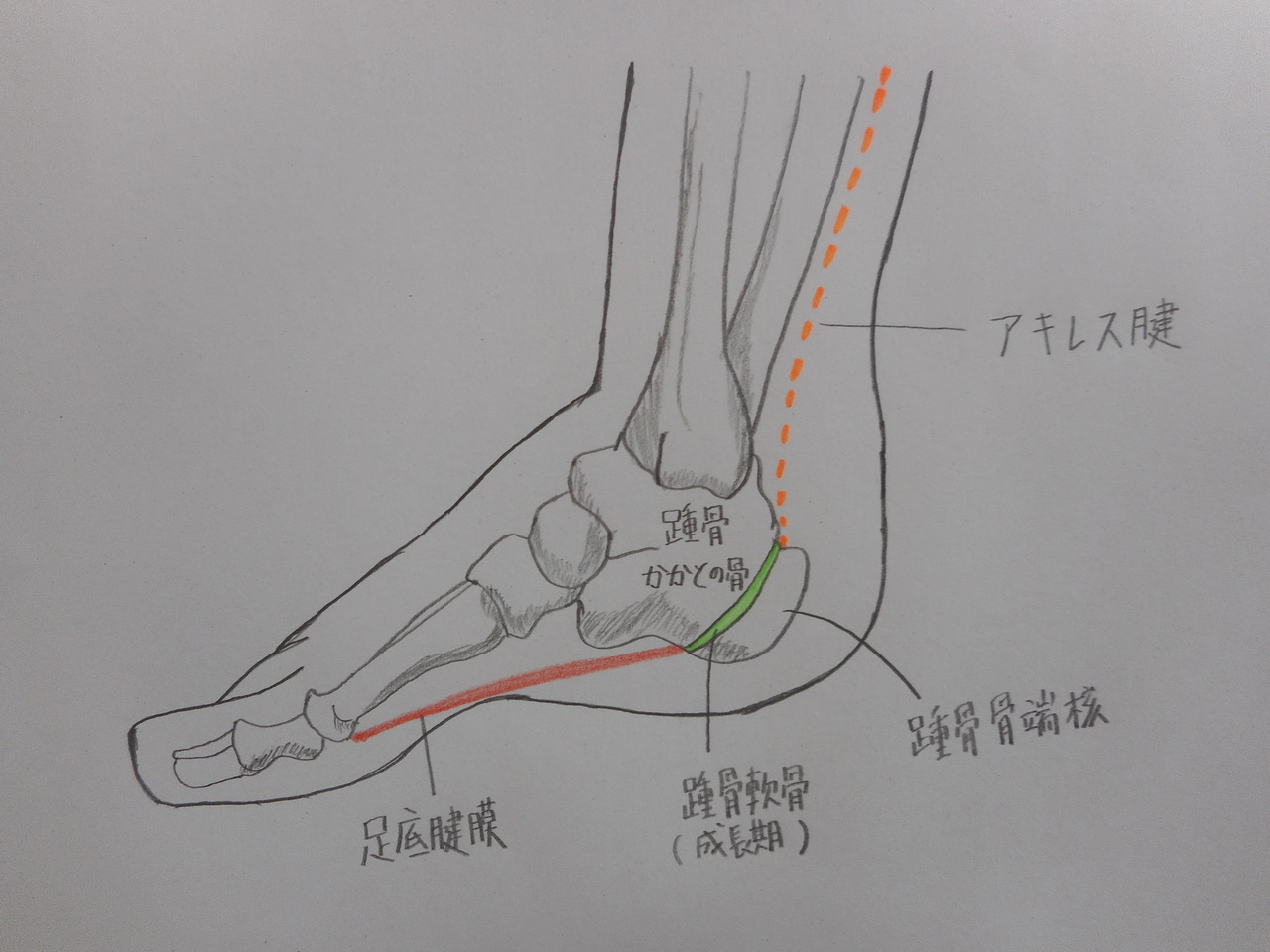 子どものかかとの骨は成長して大きくなるため、成長期には大人と違って一体化しておらず上の図の緑色で示した踵骨軟骨(成長軟骨)と呼ばれる柔らかい部分があります。