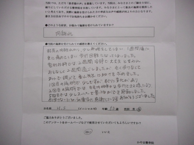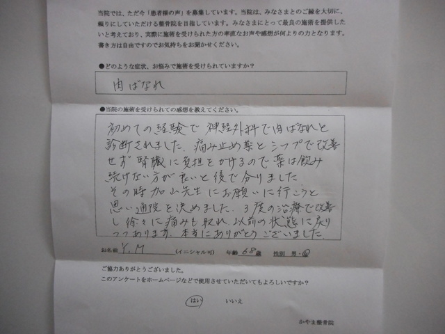 3度の治療で改善し、徐々に痛みも取れ、以前の状態に戻りつつあります。本当にありがとうございました。