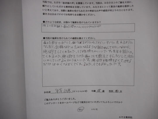 痛めた部分をほぐして、なおるようにやってもらいすぐに走れるようになったり、記録などのためになるような話をしてもらいながら、施術をしてくれるので、とても気持ちがいいです。先生も話にのってくれるので、施術をうけた後のことを教えてもらったりして、次にいかしていけるのがうれしいです。施術も気持ちよくて、できるだけはやくなおしてくれるので、とてもよかったです。