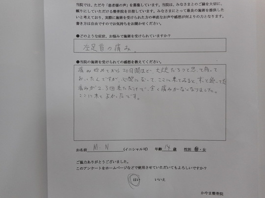 痛み始めてから20日間ほど、大丈夫だろうと思って放っておいたんですが、心配になって、ここに来てみると、ずっと続いてた痛みが2,3回来ただけで、全く痛みがなくなりました。ここに来てよかったです。