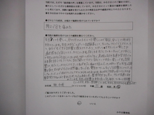 先生はとても優しく、受け付の方もとても優しいので毎回、安心して施術を受けています。先生は同じスポーツ経験者として、たくさんアドバイスを下さったり、自分でもできる調整を教えて下さったり、スポーツをすることの楽しさや達成感などを話して下さったりしています。スポーツだけでなく、高校の話や友達や学校での出来事を話してもこころよく話を聞いて下さり、話していて本当に楽しいです。調整は、すごくしっかりとして下さって私がすごく痛めて悩んでいた時にずっと先生の調整を受け、おかげで今では全然痛くないです。電気やクリームなどで調整をして下さったり、ウォーターベッドで体をリラックスさせてくれるものもあります。私は同じ陸部の後ハイにかやま整骨院をすすめられて来ましたが、今では本当に良い整骨院だなと思い、何人か友達にすすめています。先生の調整は本当に良いです。毎回、ていねいに調整していただき、本当に感謝しています。先生も受け付けの方も最高です!!