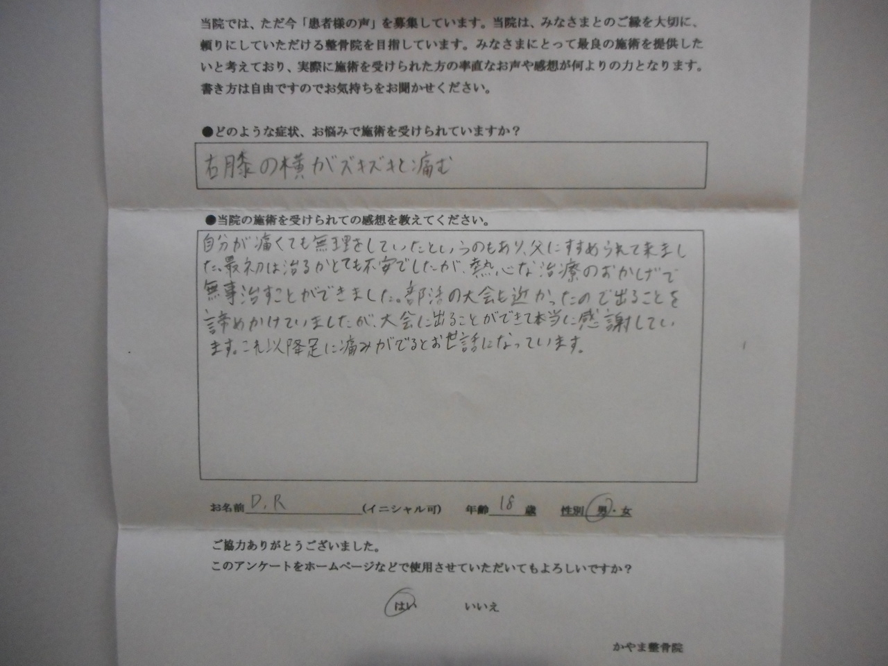 すごく先生がやさしくて、話しやすいので、リラックスして施術を受けることができるのですごくよいです。いたいことをするのかなと思ってたら、そんなことなく、気持ちよく施術を受けることができました。最初なにもしていないときはひざがじんじんして練習に集中できなかったけど、施術を受けてから、最初よりだいぶんましになってきている。