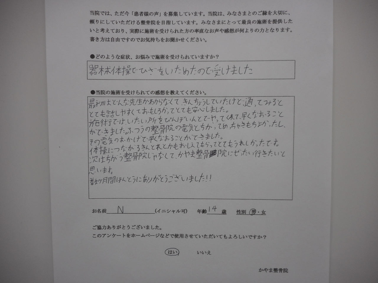 体操につながるきんとれとかもおしえてもらってとてもうれしかったです。次はちがう整骨院じゃなくて、かやま整骨院にぜったい行きたいと思います。数ヶ月間ほんとうにありがとうございました!!