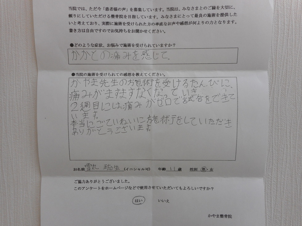 電気のやつは痛かったけど、施術をしていくうちに楽になり、またサッカーを再開することができました。かやま整骨院に通ってよかったです。また、お世話になることがあると思いますが、よろしくお願い致します。ありがとうございました。